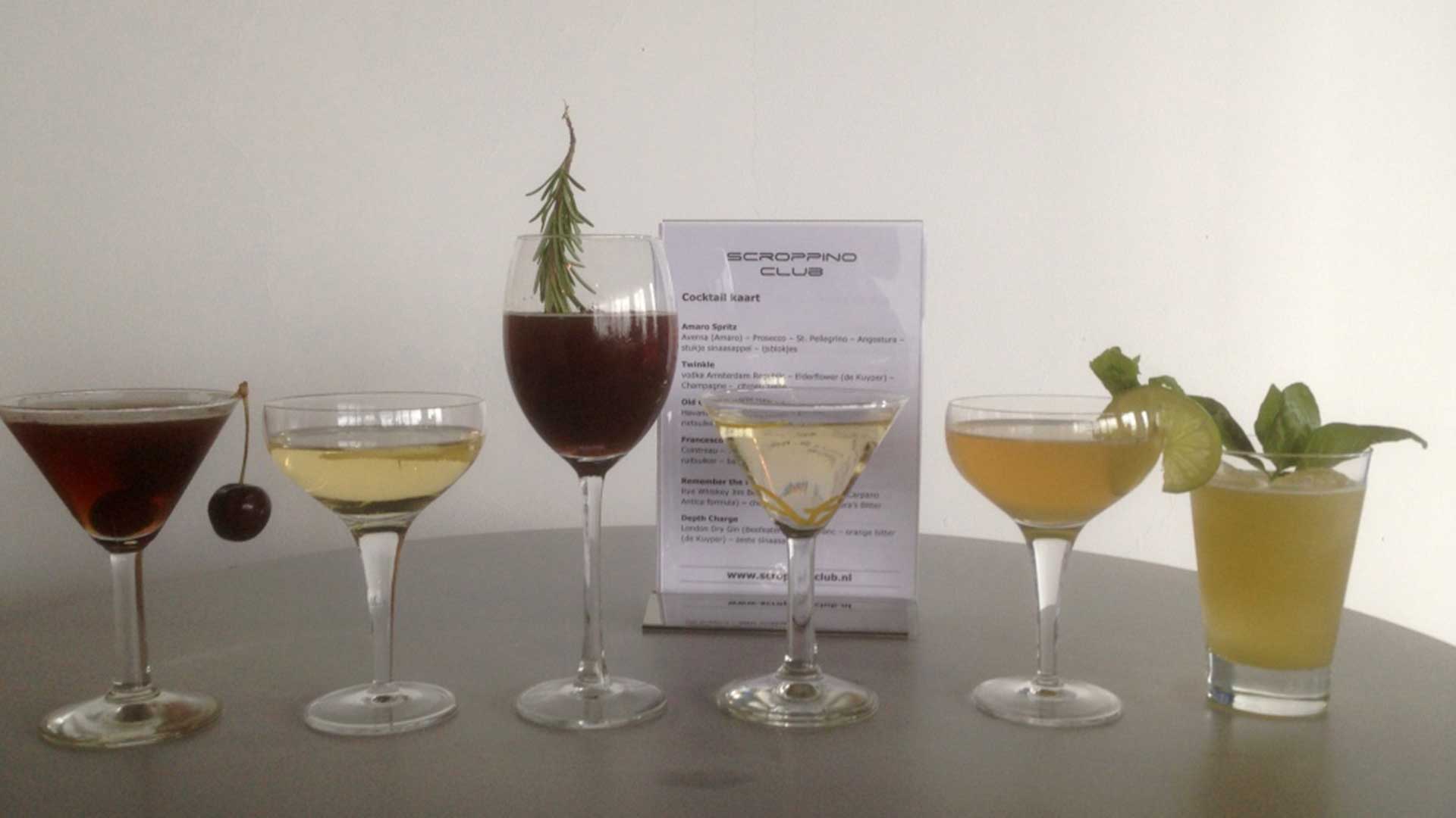 Keukenspullen: office mesje, snijplank, Boston shaker, Cocktail strainer (zeefje), barmaatje, barlepel, Champagne coupe, rietje, roerstaafje